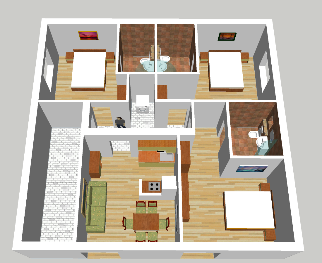 It has air conditioned bedrooms with double beds and comfortable sofa bed for 2 persons in living room.